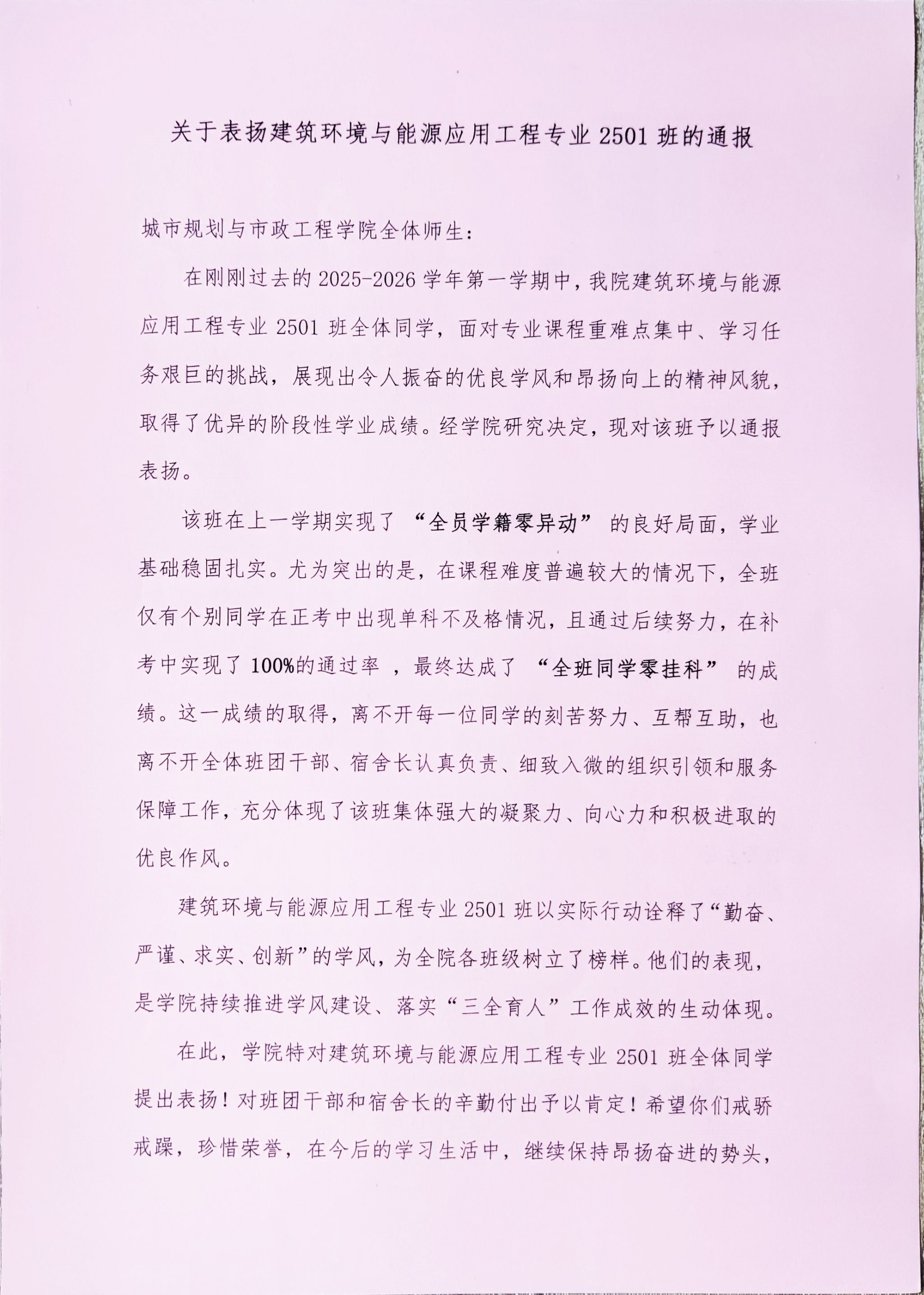在刚刚过去的2025-2026学年第一学期中,beat365官网建筑环境与能源应用工程专业2501班全体同 学,面对专业课程重难点集中、学习任务艰巨的挑战,展现出令人振奋的优良学风和昂扬向上的精神风貌,取得了优异的阶段性学业成绩。经学院研究决定,现对该班予以通报表扬。