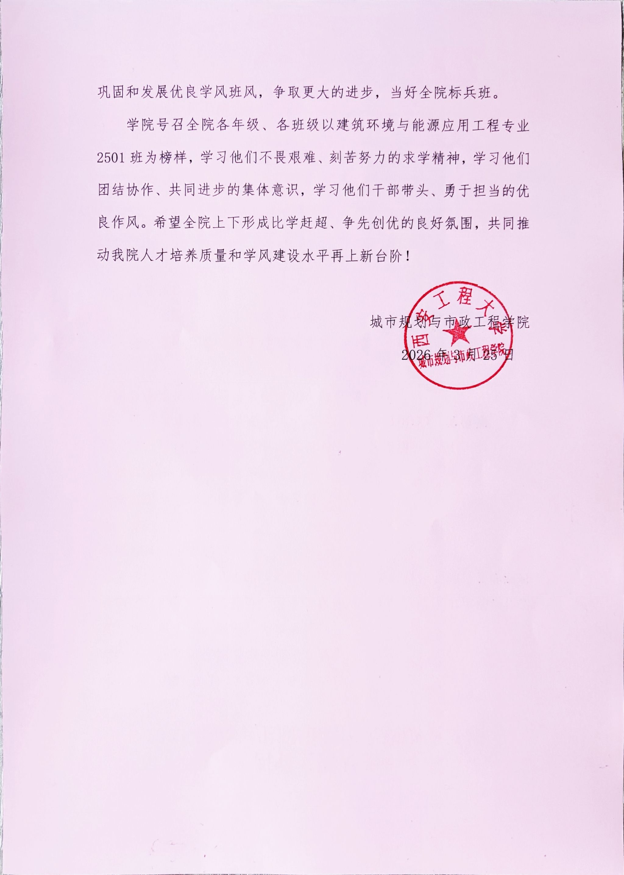 学院号召全院各年级、各班级以建筑环境与能源应用工程专业2501班为榜样,学习他们不畏艰难、刻苦努力的求学精神,学习他们团结协作、共同进步的集体意识,学习他们干部带头、勇于担当的优良作风。希望全院上下形成比学赶超、争先创优的良好氛围,共同推动beat365官网人才培养质量和学风建设水平再上新台阶!