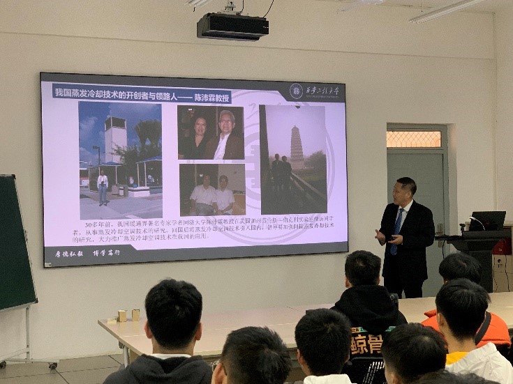 黄翔教授就他本人主编的本科生教材《空调工程》中的空气处理及设备和空调系统中的蒸发冷却技术方面的知识分别从蒸发冷却技术的发展历史、原理、设备、应用以及最新技术进行了深刻且简洁的讲解。特别值得一提的是,授课开始,黄翔教授即给同学们介绍了我国蒸发冷却技术的开创者与领路人陈沛霖教授对蒸发冷却做出的贡献,并通过播放关于蒸发冷却技术运用的央视新闻给同学们说明蒸发冷却技术的重要意义。