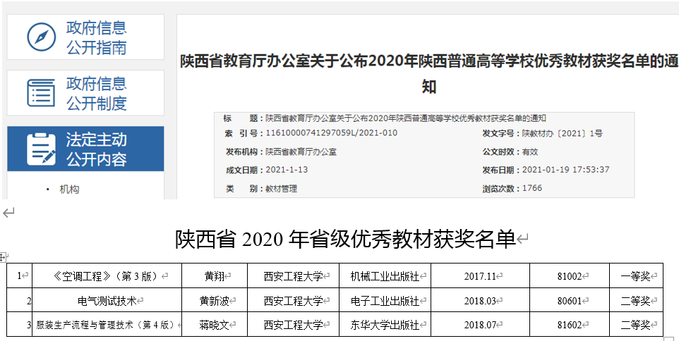 近日,陕西省教育厅印发《关于公布2020年陕西普通高等学校优秀教材获奖名单的通知》(陕教高办〔2021〕1号),beat365vip官网登录入口黄翔教授主编的《空调工程》(第3版)获得省级优秀教材一等奖。