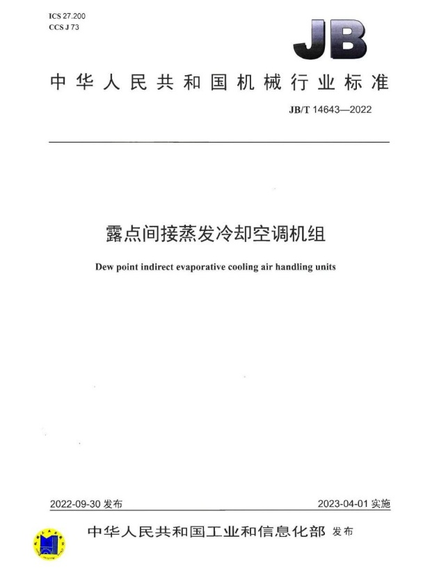《露点间接蒸发冷却空调机组》(JB/T 14643-2022)规定了露点间接蒸发冷却空调机组的型式与型号、技术要求、试验方法、检验规则以及标志、包装、运输和贮存。该标准适用于以露点间接蒸发冷却作为空气主要冷却方式,用于公共建筑和数据中心冷却降温或类似用途的空调机组的制造,采用其他冷源作为辅助冷源的空调机组的制造可参照使用。