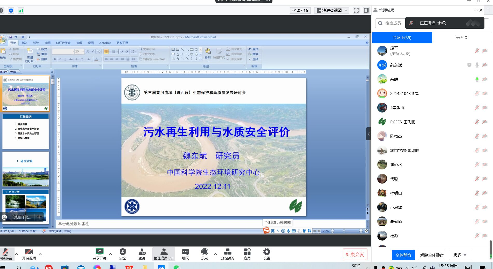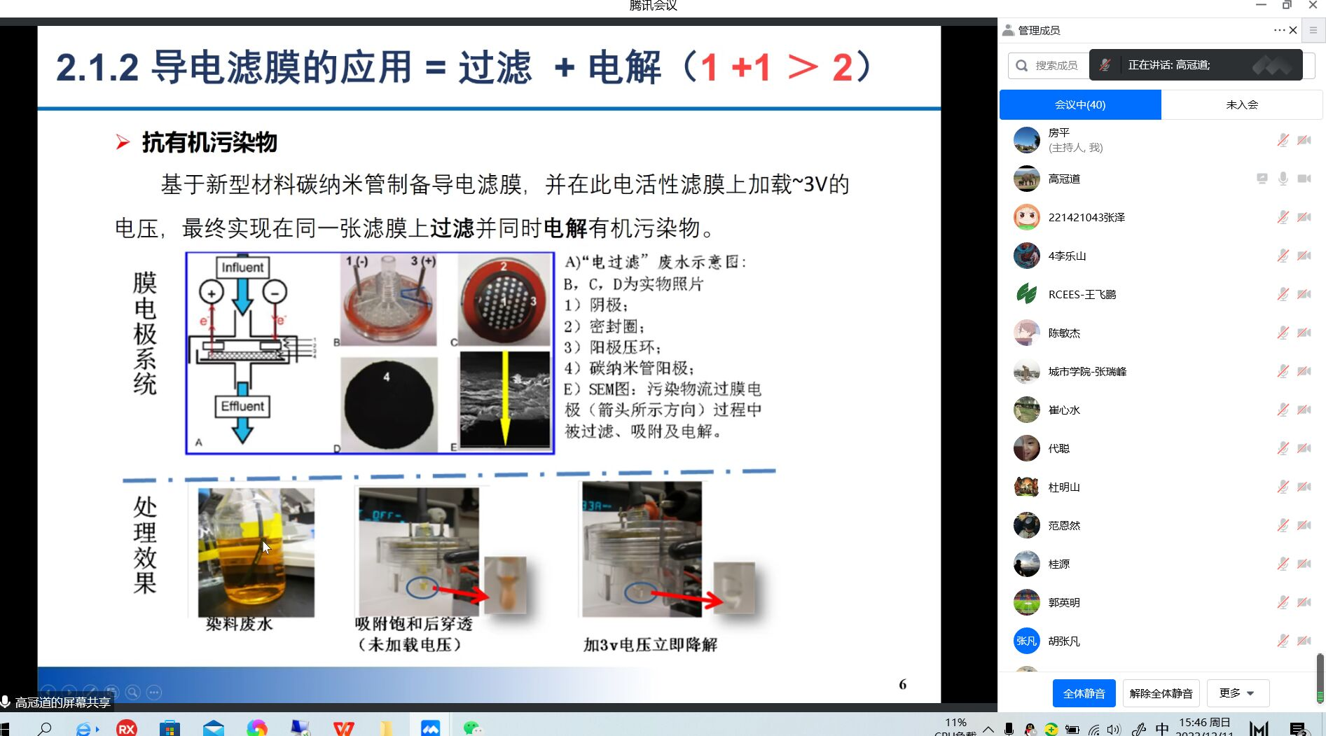 研讨会上,与会专家学者纷纷发言,与我校师生热情交流,激烈讨论,共同为黄河流域生态保护和高质量发展建言献策。东京大学郭威副教授对《植物表型组学在农业及自然生态系中的技术开发及应用》进行了深刻的解读;博士生导师魏东斌从黄河流域生态保护和高质量发展出发,结合《污水再生利用与水质安全评价》对再生水水质标准、再生水安全管理进行讲解;南京大学高冠道教授以《电调控低碳水处理技术—以自清洁滤膜为例》为主题,深度剖析导电滤膜的性质并从膜电极系统入手,进而对膜处理效果进展示;beat365vip官网登录入口硕士生导师李晶以《隋唐长安传统水治理方式初探》的题,对传统水治理方式进行细致的阐述;beat365vip官网登录入口硕士生导师赵娟介绍了太阳能光伏光热利用技术的研究过程及成果。