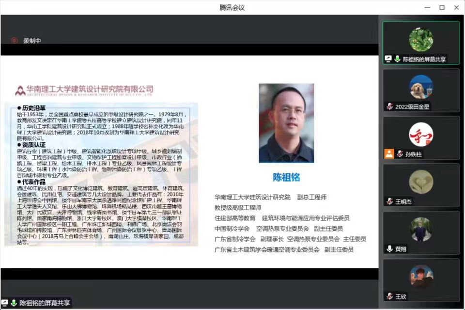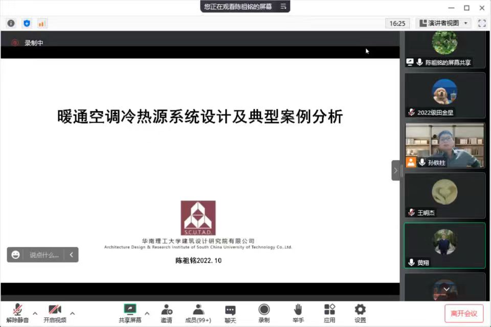 2022年10月25日,应beat365vip官网登录入口邀请,华南理工大学建筑设计研究有限公司陈祖铭工程师为学院师生做了“暖通空调冷热源系统设计及典型案例分析”的线上专题讲座。讲座由建环系系主任孙铁柱主持,学院建环系教师、本科生以及研究生聆听了讲座。