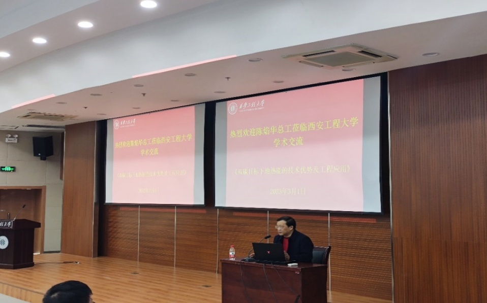 2023年3月1日,应beat365vip官网登录入口邀请中信建筑设计研究总院有限公司陈焰华总工程师,在临潼校区图书馆报告厅为学院师生作了题为《双碳目标下地热能的技术优势及工程应用》学术报告。报告由学院副院长强天伟教授主持,学院相关专业师生近100人参加了此次报告会。