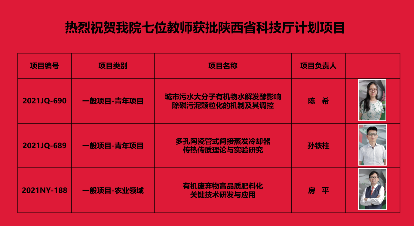 近日,beat365vip官网登录入口陈希、孙铁柱、房平、王雪艳、郭英明、李红玑、颜苏芊等7位教师申报的项目,获批2021年陕西省科技计划项目。