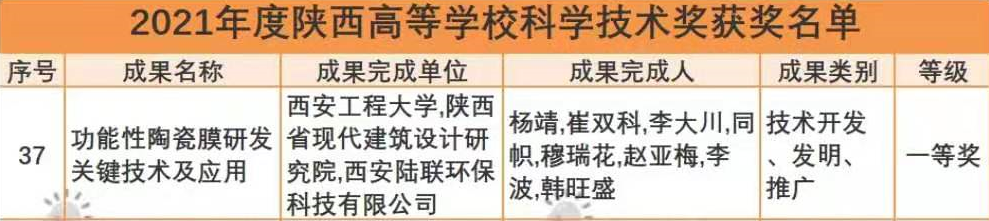 2021年1月29日,2021年度陕西高等学校科学技术奖评审结果出炉,beat365官网杨靖教授、李波老师申报的《功能性陶瓷膜研发关键技术及应用》获一等奖。