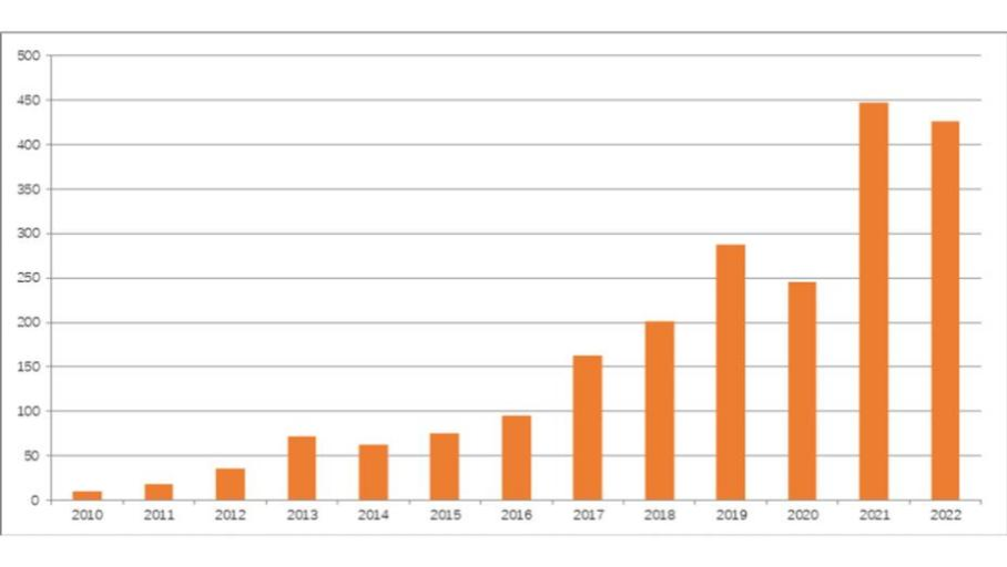 图1 2010—2022年云计算数据中心冷却专利技术申请量