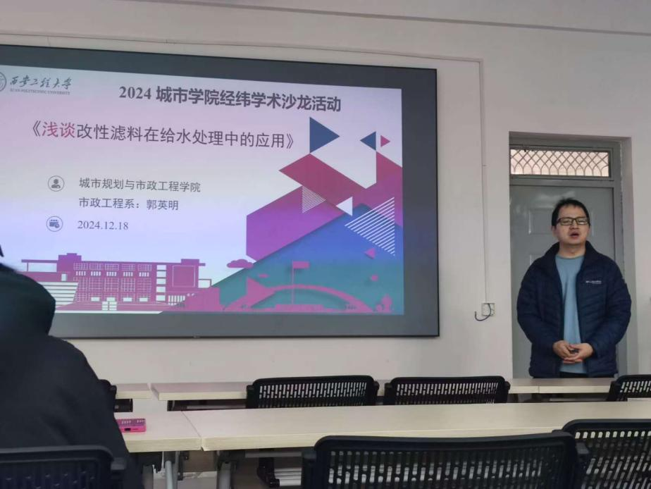 学术的火花在这里碰撞,智慧的火花在这里绽放。2024年12月18号上午,beat365vip官网登录入口在学院322会议室举办“一院一品”丝路大讲堂系列活动。本次学术讲座主题为《浅谈改性滤料在给水处理中的应用》,由beat365官网市政工程系教师郭英明老师主讲,研一、研二全体学生参加。
