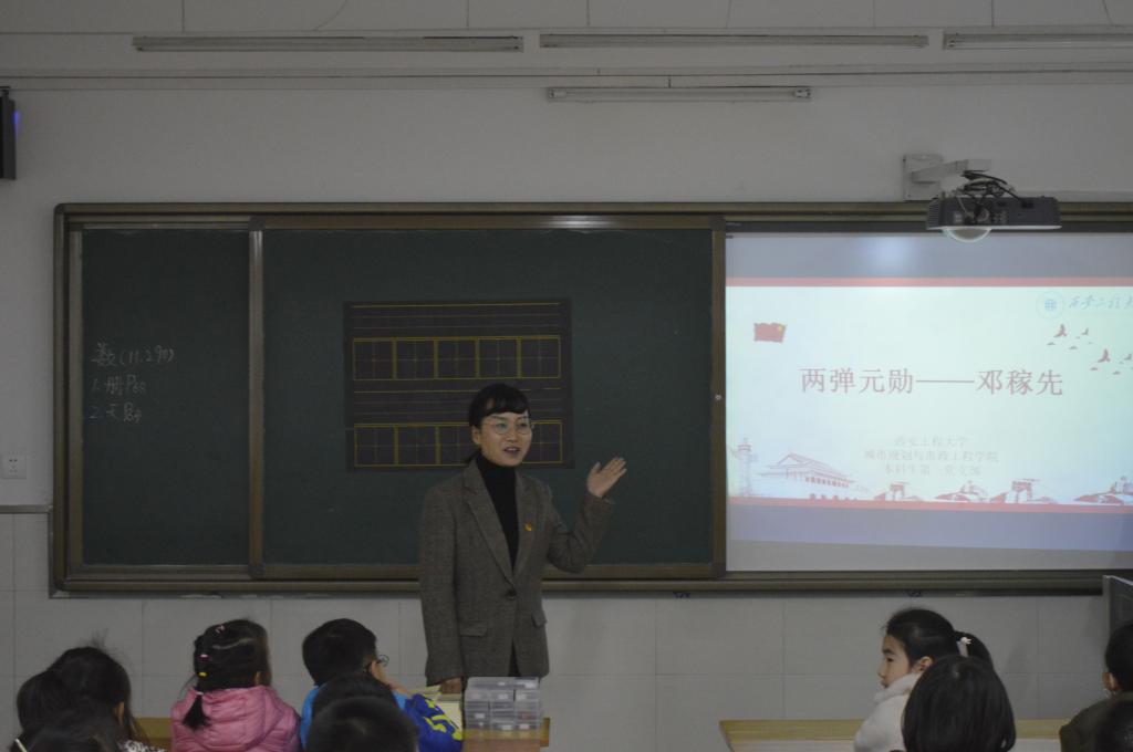 2019年11月29日下午,为贯彻落实 “不忘初心、牢记使命”主题教育精神,beat365vip官网登录入口学生第三党支部在铁五小学一年级开展了主题为“两弹元勋——邓稼先”的爱国主义教育课。参与活动的有铁五小一年级教师,铁五小一年级学生以及beat365官网本科生第三党支部学生党员。本科生第三党支部书记张苹带队开展活动。