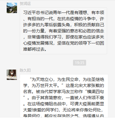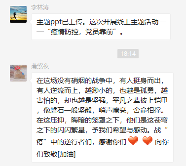 最后,支部书记张苹老师总结发言,感谢我们每位同学。“哪有什么岁月静好,只不过是有人替我们负重前行”。一位党员就是一面旗帜,作为党员的我们,更应勇于担当,扛起肩上的担当与责任。我们都是中华儿女这个大家庭的一员,我们与这个大家庭的每一份子同在,众志成城,祝愿早日战胜疫情!早日迎来春暧花开!