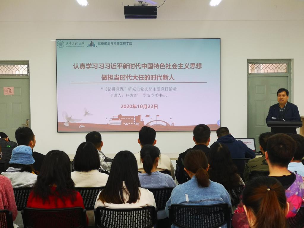 会议首先由杨友谊为新入校的研究生党员讲了一堂题为“学习习近平新时代中国特色社会主义思想——做担当时代大任的时代新人”主题党课。杨友谊结合历史事迹和现实事例从“产生背景和形成、内容、重大意义和价值、如何实践,如何做担当时代大任的时代新人”五个方面向同学们详细解读了习近平新时代中国特色社会主义思想。