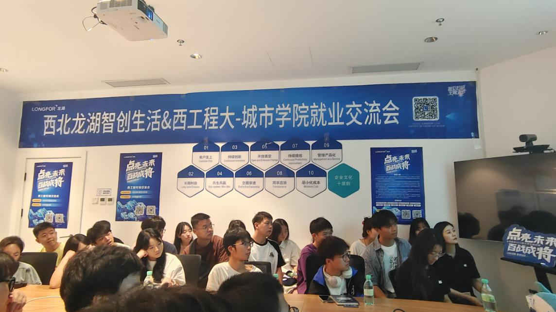 在交流会上,香醍天街商服工程职能负责人(2020级校友)肖闯结合职场经历和体验分享了自己的成长与收获。西北地区商服发展部负责人王智超和西北地区人力职能负责人王灏熹分别就企业人才培养计划和成长路径以及“点将引才”计划向同学们作了详细介绍。同学们纷纷就自己关心的问题进行积极咨询。最后,龙湖集团对31名提交简历的同学进行了分组面试。