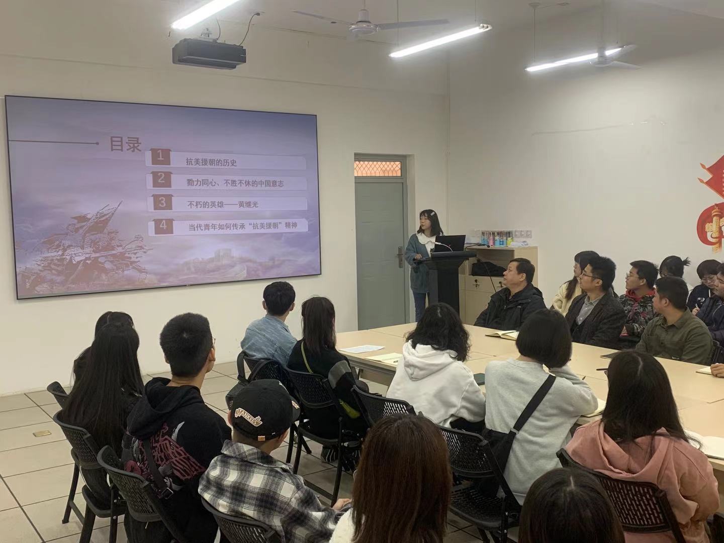 首先,郭可欣同志从抗美援朝的历史、勠力同心不胜不休的中国意志、不朽英雄黄继光和当代青年如何传承抗美援朝精神四个部分,通过一个又一个故事让与会党员学习了那段历史,更深刻地理解了抗美援朝精神。