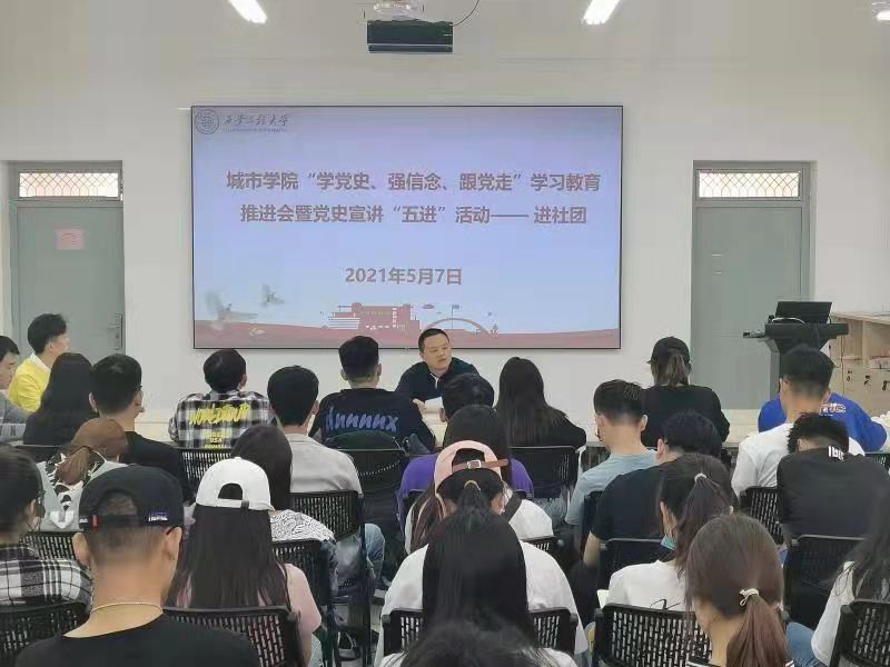5月7日中午,beat365vip官网登录入口在临潼校区8-322会议室召开“学党史、强信念、跟党走”学习教育推进会暨党史宣讲“五进”活动——进社团宣讲会,学院学工办主任、团总支书记凌旭以及学生组织各部门负责人参加活动。