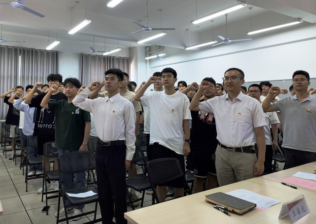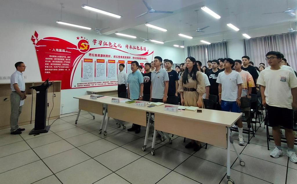 入党宣誓仪式在雄壮的《国际歌》声中拉开帷幕。宣誓仪式由学院党委书记王劲伟领誓,52名预备党员举起右手握拳,面向党旗庄严宣誓。