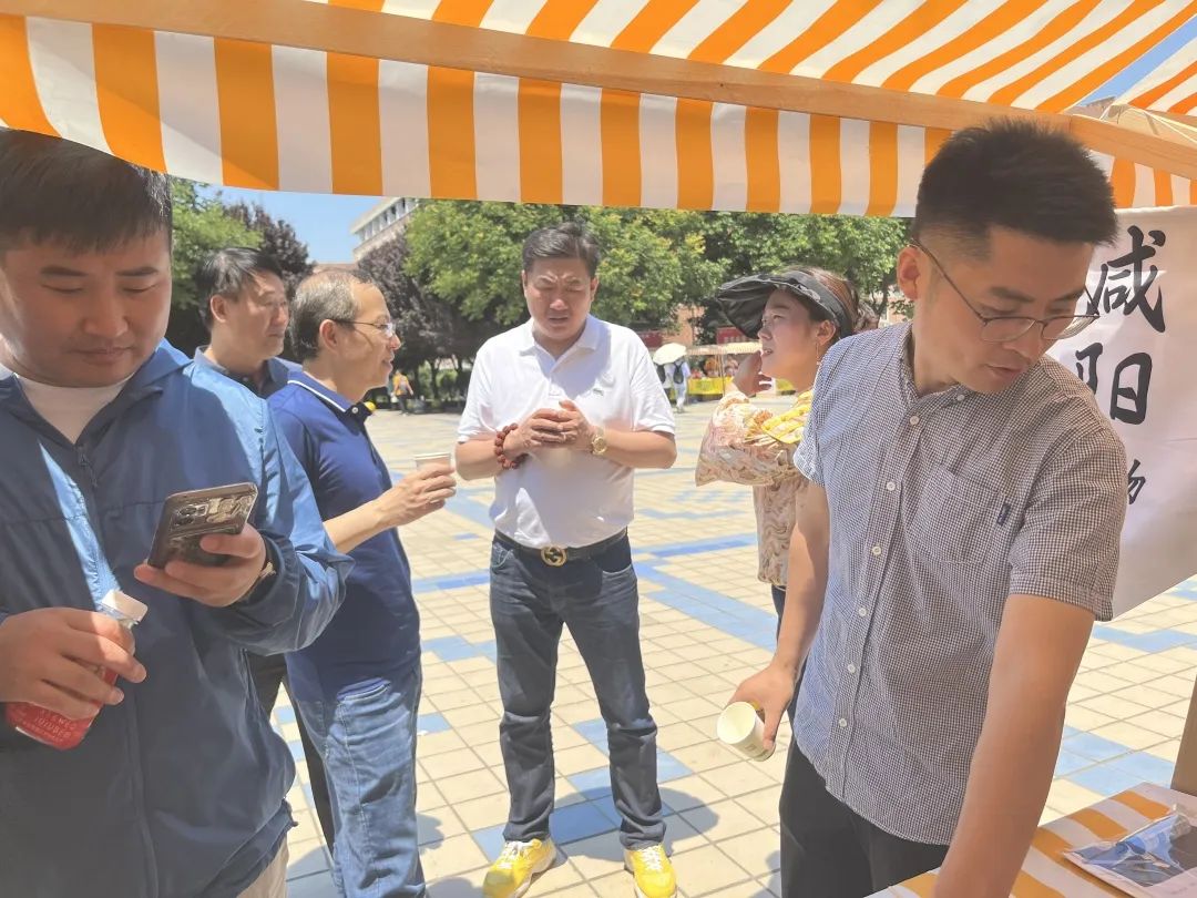 6月14日上午,beat365vip官网登录入口乡村振兴办主任赵宏、副主任樊运清;beat365vip官网登录入口党委书记王劲伟等领导与陕西御水涵山文化传媒有限公司董事长房琦共同参观了大学生线下助农推广活动,由陕西御水涵山文化传媒有限公司总经理刘晓娜介绍活动现场,以及推广赛事、大学生助农推广团。