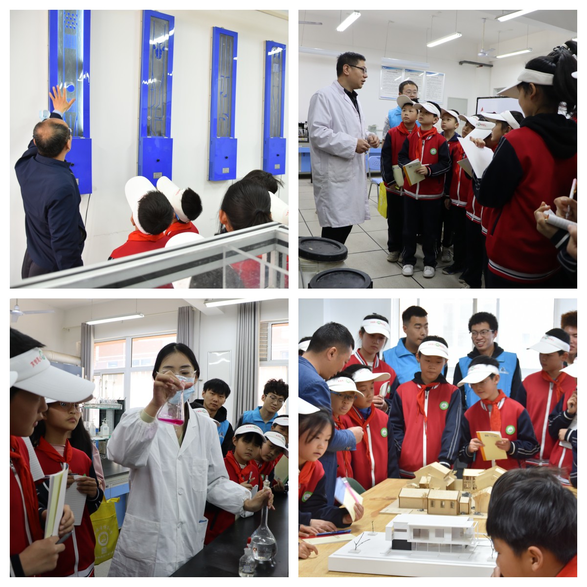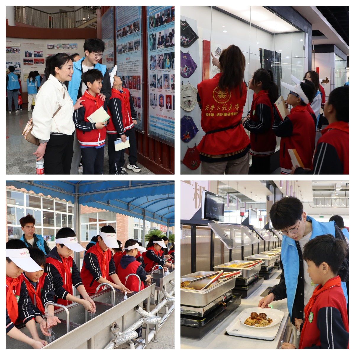 仪式后,小学们开始参观学院实验中心、中纺联重点实验室,实验室老师分别为他们讲解和演示了流动显示实验、自来水工艺流程、酸碱滴定实验、结构力学模型、室内外景观设计模型,身边的哥哥姐姐作补充讲解。小学生们那一双双对知识渴望的眼睛和在小笔记本上速记重点的小手,让人怎不忆少年。随后,小学生们走进工程大百年校史长廊,近距离感受学校“实业报国、负重奋进”办学传统,惊叹校友名家设计大师的代表之作,开始憧憬自己的大学专业。三层展厅千件展品大饱眼福之后,小学生在志愿者的带领下打卡学校网红餐厅,色香味俱全的菜品、餐厅叔叔阿姨们热情的服务,让他们吃得美味又开心。