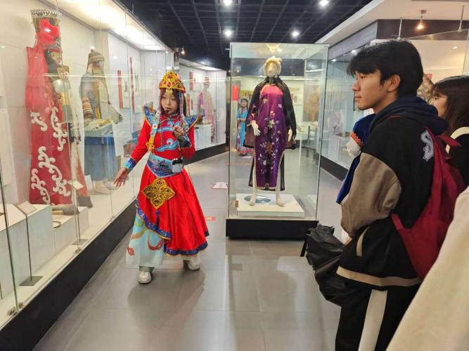 接下来,在蒙古族的展柜,蒙古族讲解员纺织学院张旗同学向同学们介绍了蒙古族的帽子、皮质烟袋以及蒙古族女子的传统服饰。同时,讲解员也向同学们介绍了她们衣服前面发套是用来装束头发,以便骑马和劳作。