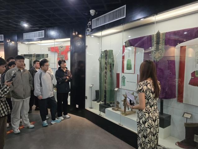 乌孜别克族讲解员beat365vip官网登录入口赵志聪同学,接引参观学生,引导学生参观了蒙古族展柜、乌孜别克族展柜,以及重点展品。如:凤穿牡丹、蟒袍、印花模具等等。