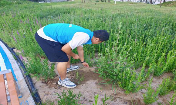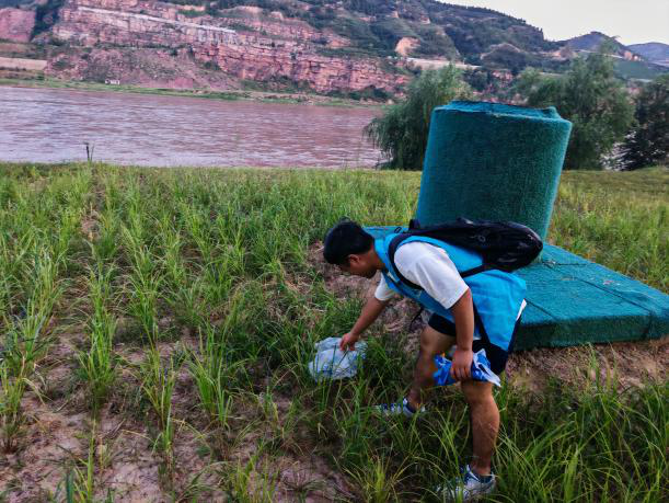 炎炎烈日下,身着统一志愿者服装的师生们迅速行动。他们细致排查黄河滩涂上的每一个卫生死角,弯腰捡拾塑料瓶、废弃包装袋、碎纸片等各类垃圾。汗水浸透了衣衫,但师生们毫无怨言,经过数小时细致清理,河岸环境焕然一新,黄河母亲重现洁净容颜。三个多小时的高强度作业,汗水在天蓝色马甲上浸出深色盐渍。当夕阳为河面镀金时,千米滩涂重现自然肌理,波光中再不见刺眼的人工造物。