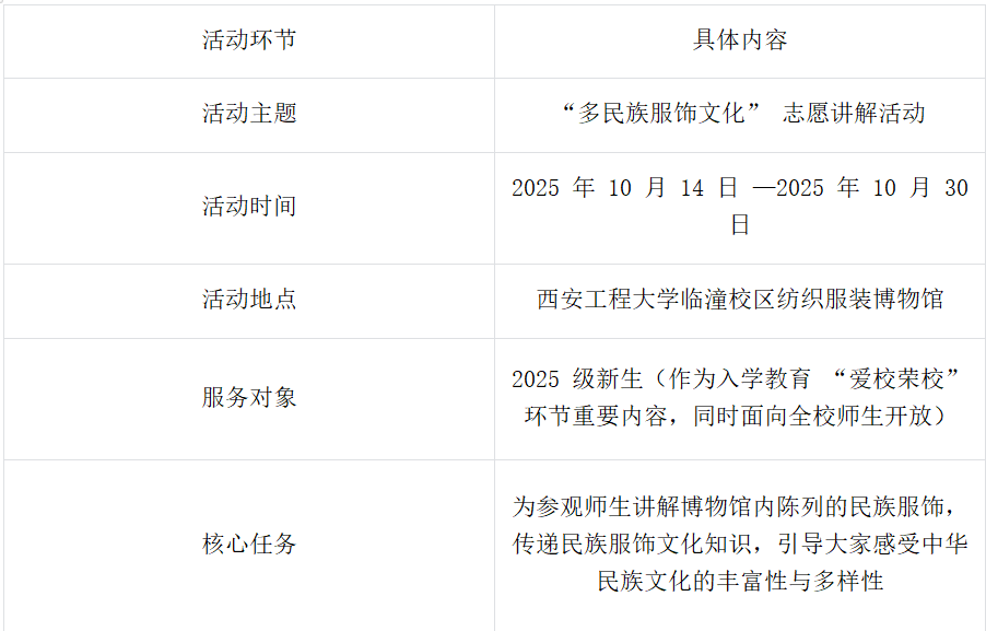 作为志愿讲解员,你不仅是知识的传递者,更是民族交流的桥梁。若你是少数民族同学,可分享家乡服饰的故事,让更多人听见民族文化的鲜活声音;若你是汉族同学,能在交流中收获不同民族的文化视角。我们将搭建跨民族交流平台,让不同民族的学生在服饰文化的碰撞中相互理解、彼此认同,为校园注入更多元的文化活力。