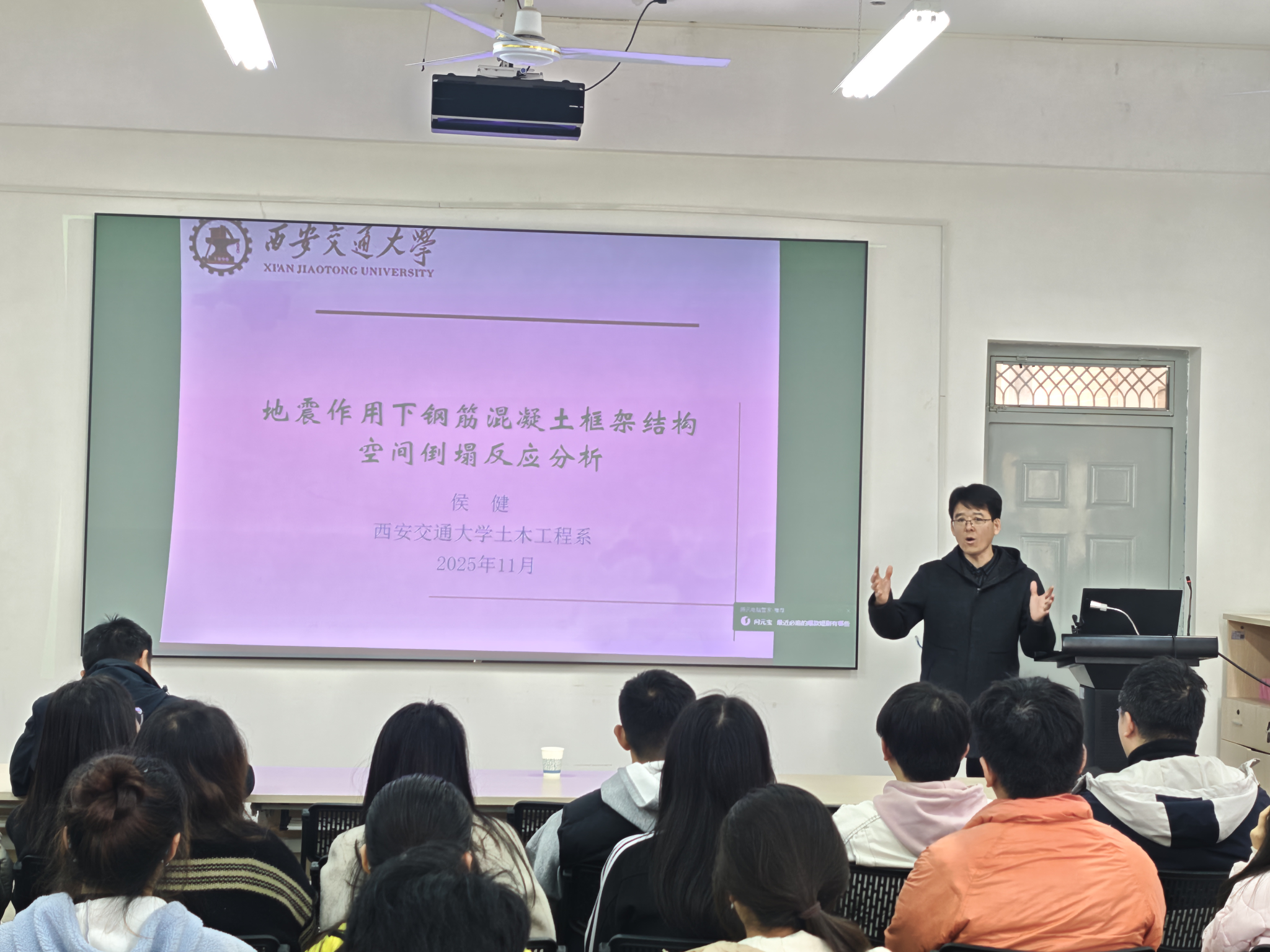 11月14日上午10时,beat365vip官网登录入口beat365vip官网登录入口“丝路大讲堂”第十一期学术报告在8-322报告厅顺利开讲。本次讲座特邀西安交通大学土木工程系侯健教授担任主讲,以《地震作用下钢筋混凝土框架结构空间倒塌反应分析》为题,为全院师生带来了一场聚焦结构抗震领域的前沿学术分享。