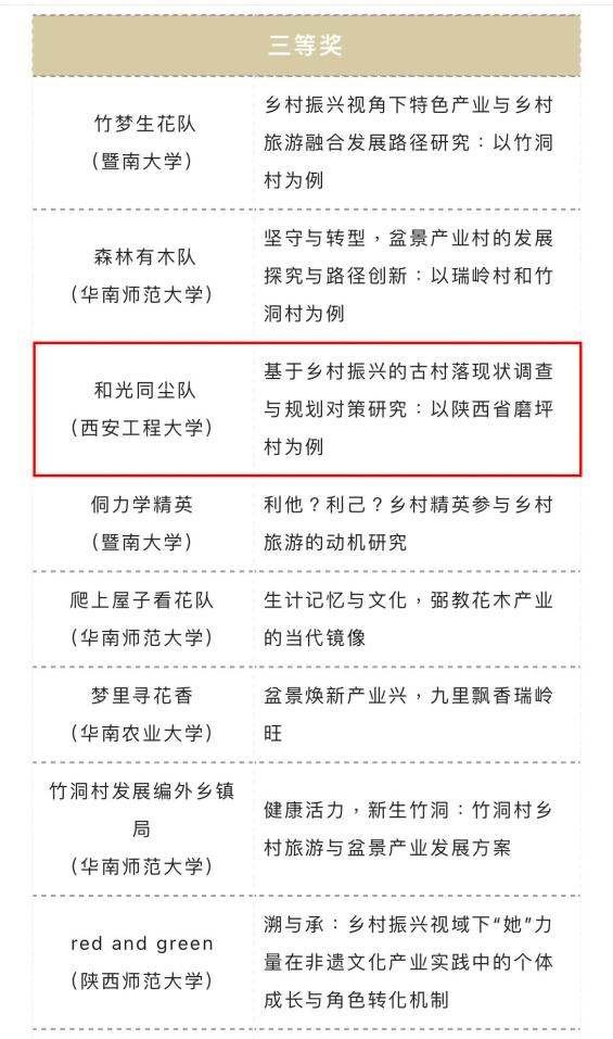 近日,由中山大学旅游学院、广州市花都区赤坭镇人民政府联合主办,中山大学旅游休闲与社会发展研究中心与“大湾区人文共同体”广东省哲学社会科学重点实验室承办的第七届全国大学生“发现传统村落”调研大赛在中山大学落下帷幕。比赛共吸引全国百余所高校的193份作品报名参赛,涉及全国19个省、自治区、直辖市的140多个传统村落,并首次收到来自美国高校研究生队伍的优秀作品。本次大赛共评选出主赛单元优秀参赛作品39份,其中一等奖2名,二等奖5名,三等奖10名以及优秀奖22名。经过激烈角逐,由beat365官网李晶老师指导,风景园林专业2019级学生李心元、张洲源、邓智龙和宋奕霖团队完成的《基于乡村振兴的古村落现状调查与规划对策研究:以陕西省磨坪村为例》调研报告喜获主赛单元参赛作品三等奖。