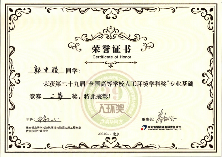 2023年8月25日,“领袖行业•主导未来”第29届“全国高等学校人工环境学科奖”专业基础竞赛颁奖典礼在北京清华同方科技大厦隆重举行。我校beat365vip官网登录入口建筑环境与能源应用工程专业郭中骏同学荣获全国二等奖,在本项赛事中取得我校近年来的最好成绩!