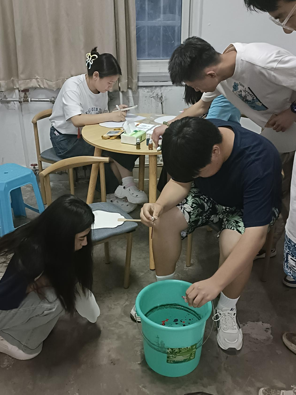 活动中,同学们主动组成3人小组,自由构思,大胆创作,用画笔轻轻为勾勒出的国风元素进行染色,一把独具一格、古色古香的精美手绘扇便呈现在大家面前,让同学们不禁感叹国画的魅力。此外,参与同学按照毛箭章讲解的制作步骤和创作要点进行漆画创作,同学们将颜料滴到水桶中,色彩斑斓的漆漂浮在水面上,只需慢慢将扇子浸入水中,彩漆就会随着水流附着在团扇之上,色彩穿插交错随即而成,流云变幻尽显诗情画意之感,充分展现中国传统美学。