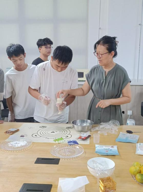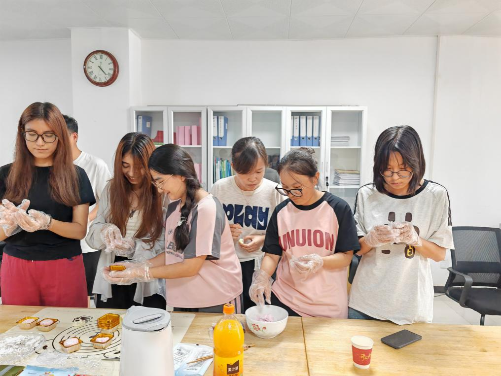期间,学院师生欢聚一堂、其乐融融。参与同学在王劲伟书记和马云院长的“一对一”指导下,纷纷动手制作“独家定制”的冰皮月饼,同学们跟随马云院长的示范,将面皮搓圆、压扁,包入香甜的馅料,再用虎口团紧将月饼封口;随后,同学们精心挑选模具花型,将月饼按压成型。制作过程虽然繁琐,但是每个人都乐在其中,师生在温馨愉悦的氛围中共同庆祝着中华民族传统节日、共同感受着中华优秀传统文化跨越时空的独特魅力。