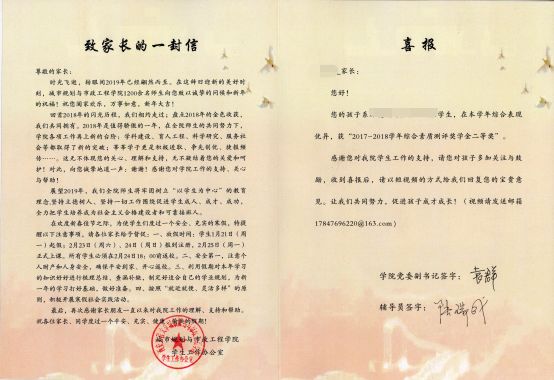 beat365官网对在2018年度荣获国家奖学金、国家励志奖学金、综合测评奖学金、新生奖学金以及获得省级及以上科技、学术竞赛奖项的学生进行摸底统计后,在表彰先进的同时,以寄送喜报的方式向家长报喜。本次共寄出喜报210余份。