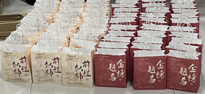 最后,为了表达学院对考研学生的关怀与祝福,学院为每位考研学子精心准备了“祝福礼包”,其中包含花生(寓意“好事发生”)、苹果(寓意“平安上岸”)、牛奶等能量包(寓意“能量满满”)以及师生们的暖心祝福卡片。这些小礼物饱含学院的深情厚意,也让现场氛围更加温馨。
